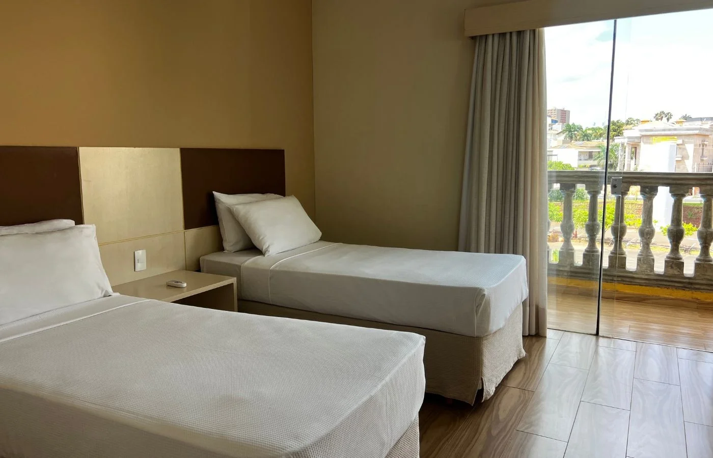 A Suíte Luxo é dividida em dois espaços que oferecem o máximo conforto para você. O quarto principal, decorado com tons suaves e aconchegantes, pode ser configurado com uma cama de casal ou duas camas de solteiro, proporcionando flexibilidade para diferentes tipos de hóspedes. A sacada proporciona uma vista incrível para a piscina. A sala independente, é equipada com um sofá-cama de casal e uma poltrona-cama de solteiro, oferece um ambiente acolhedor e versátil, perfeito para relaxar ou acomodar membros adicionais da família. Esta suíte é ideal para famílias de 3 adultos e duas crianças até 12 anos, garantindo uma estadia memorável com conforto e praticidade