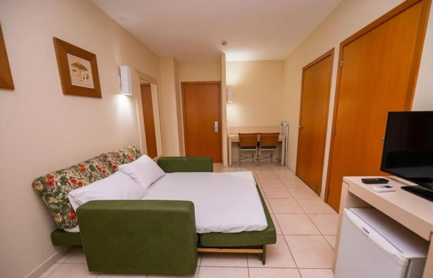 de uma cama de casal ou duas camas de solteiro, enquanto a sala independente, equipada com um sofá-cama de casal e uma poltrona-cama de solteiro, oferece flexibilidade para acomodar hóspedes adicionais. Complementando o ambiente, uma sacada convida os visitantes a relaxar enquanto apreciam uma bela vista. Ideal para 3 adultos e duas crianças até 12 anos, esta suíte combina conforto, funcionalidade e charme, garantindo uma estadia incrível.